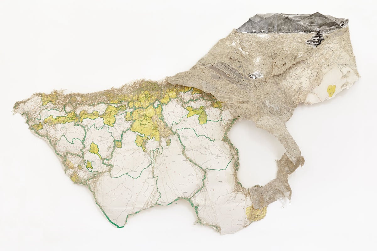 carte IGN, peinture, cire, calque topographique, carton, fil de fer, images de presse, henné, couture machine, couture main, 160 x 70 x 25 cm