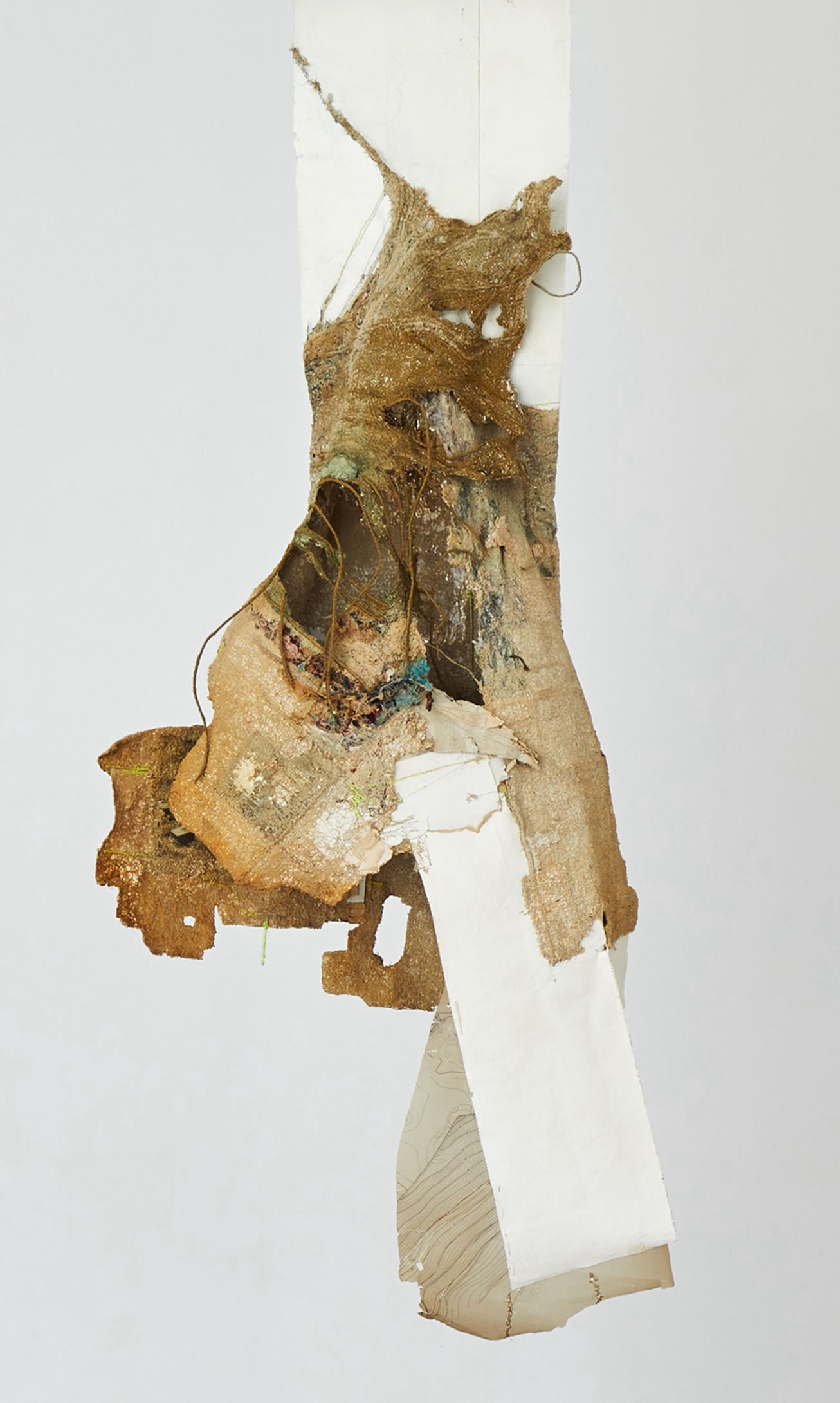 IGN map,paint, wax, topographiclayer, cardboard, wire,press photographs,henna, machine- andhand-sewn stitching,160 x 70 x 25 cm.